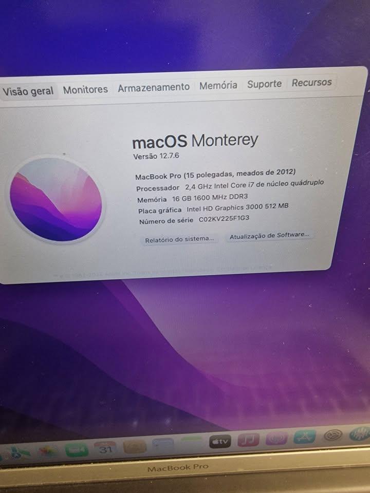 Intel Core i7, 2,4GHz ano 2012 16GB de memória DDR3, 1600MHz disco 256 SSD ecra de 15 ano 2012 Bateria NOVA Softwares: FL STUDIO 20 TRAXTOR ENGINE DJ Final cut Logic Pro OFFICE 2019 Photsop Adobe Lightroom adobe inDesign e outros programas poderá ver nas fotos poderá ver mais características nas fotos envio pelo Ctt expresso não faço trocas por outros produtos recebo retorno portáteis da APPLE poderá ver e ser testado no meu atelier de informática
