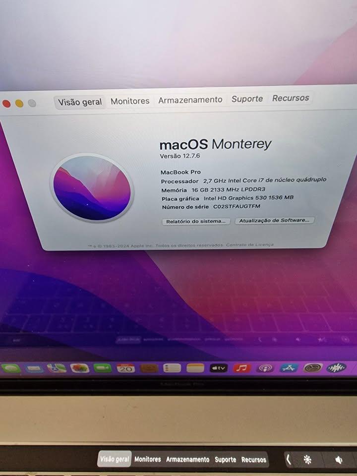 Intel Core i7 dual-core a 2,7 GHz, nucleo qudruplo SSD PCIe 500 GB 16 GB de memória LPDDR3 a 2133 MHz Touch Bar com sensor Touch ID integrado Ecrã Retina Ecrã de 16 polegadas resolução nativa de 2880x1800 intelHD graphic 530 Radeon pro 455 Office Photoshop adobe after effects Illustrador FL studio Traktor Virtual DJ e outros programas poderá ver restante especificações nas fotos pode ver ser testado no meu atelier de informática