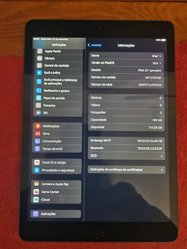 Apple iPad de 8ª geração iPadOS 18.6, atualizável para iPadOS 26.1 128 gb cor cinza espacial Geração 8ª Ecrã Retina ecrã 10.2 nao faço trocas por outros produtos pode ver e ser testado no meu atelier de informática também posso enviar por CTT expresso